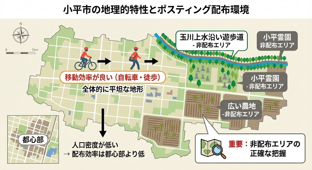 小平市は、全体的に起伏が少なく平坦な土地であることが大きな特徴です。この平坦な地形は、配布スタッフにとって移動効率が良く、自転車や徒歩でのポスティングに適しています。しかし、都心と比べて住宅面積が広いため人口密度は低く、配布効率は都心部ほど高くありません。また、江戸時代の新田開発の名残で、玉川上水沿いの遊歩道や小平霊園など緑が多く、広い農地も点在しており、これらの非配布エリアを正確に把握することが重要です。
